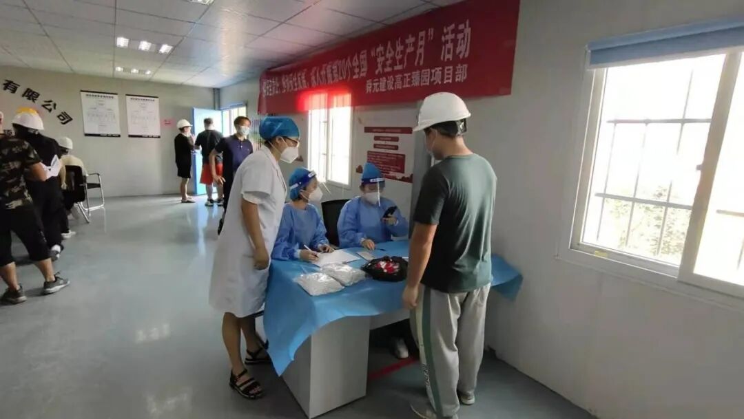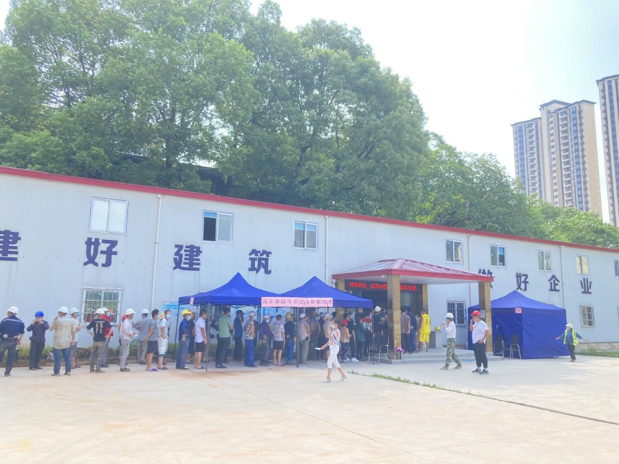 8月8日上午,为避免参加核酸检测人员扎堆,规避感染风险,项目部临时党支部、疫情防控小组开展“我为群众办实事,核酸检测进工地”活动,把长沙市圭塘社区医院医护人员请到项目部来,为现场管理人员和劳务人员进行集中核酸检测。