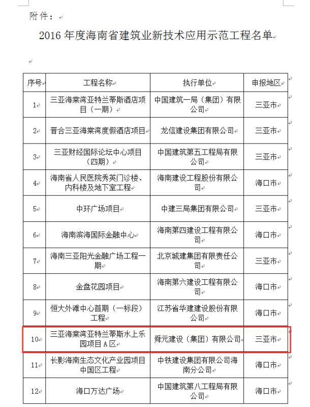 根据《海南省建筑业新技术应用示范工程管理办法》(琼建质〔2012〕101号)的规定,我厅委托海南省建筑业协会,组织专家对申报海南省建筑业新技术应用示范工程的项目进行评审。经专家评审通过,决定授予“三亚海棠湾亚特兰蒂斯酒店项目(一期)”等12项工程为“2016年度海南省建筑业新技术应用示范工程”(见附件),现予以公布。